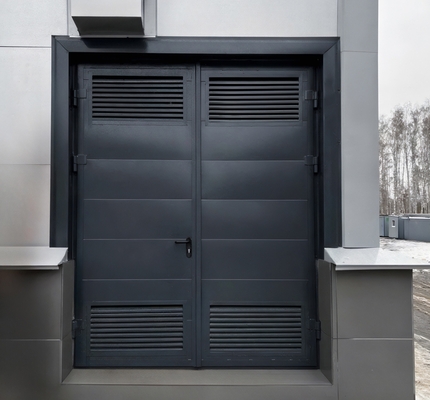 Для трансформаторных подстанций и других зданий, где требуется обеспечить естественную вентиляцию воздуха, мы выпускаем специальные модели ворот с самозаплвляющимися решетками в одной или обеих створках.