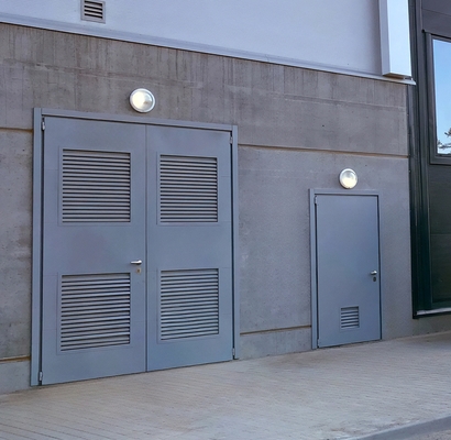 Нормы пожарной безопасности к КТП регламентируют монтаж дверей из негорючих материалов, выдерживающих прямое воздействие огня и высокой температуры в течение 30 или более минут. Поэтому для производства дверей применяется холоднокатаная сталь толщиной от 1,4 мм и теплоизоляция из каменной ваты.